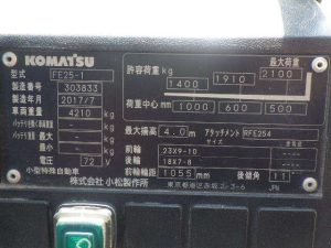 Bảng thông số kỹ thuật xe nâng điện 2.5 tấn Komatsu FE25-1 serial 303833