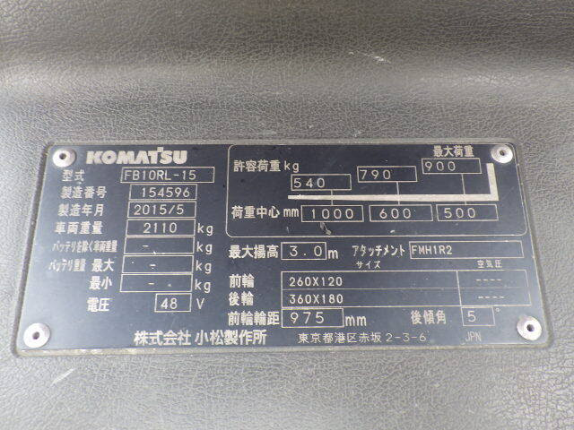 Dưới đây là các thông số kỹ thuật cơ bản của xe nâng điện đứng lái 1.0 tấn Komatsu model FB10RL-15 serial 154596